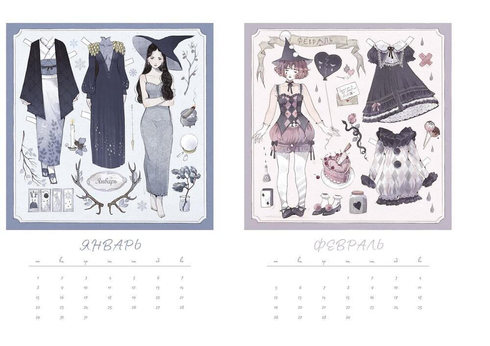 Настенный перекидной календарь с бумажными ведьмами от известного иллюстратора Loputyn. Подарок для «внутренней девочки» — 12 фигурок ведьм для вырезания, с нарядами и аксессуарами.