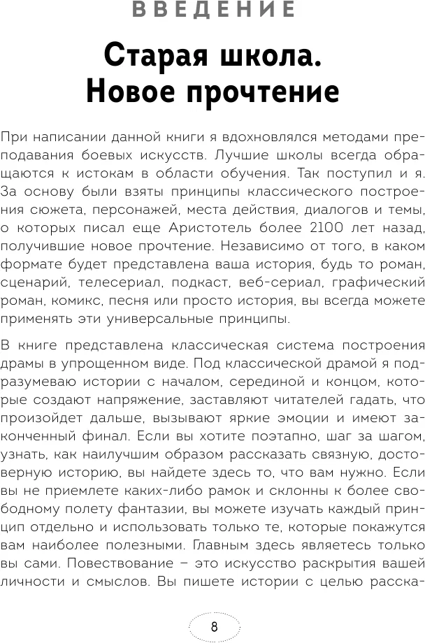 Вы не найдете здесь никакой теории литературы, академических сложных понятий или профессионального жаргона. Все двадцать семь принципов изложены на простом человеческом языке. Если вы хотите поэтапно, шаг за шагом, узнать, как наилучшим образом рассказать связную, достоверную историю, вы найдете здесь то, что вам нужно. Если вы не приемлете каких-либо рамок и склонны к более свободному полету фантазии, вы можете изучать каждый принцип отдельно и использовать только те, которые покажутся вам наиболее полезными. Главным здесь являетесь только вы сами.