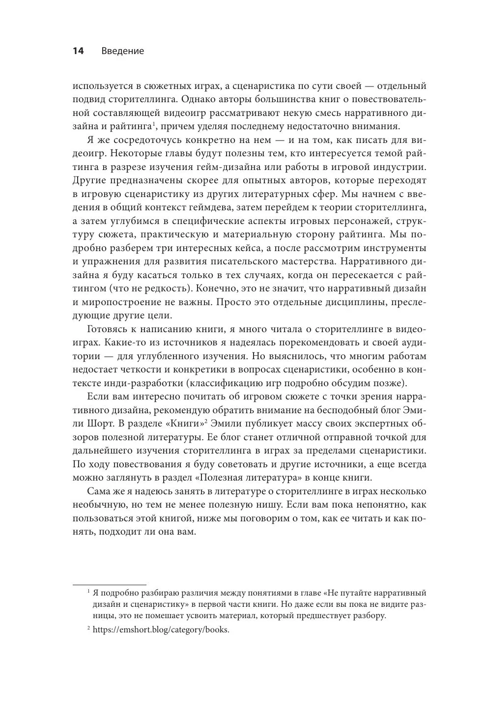 Книга — практическое руководство для игровых сценаристов, особенно в сфере инди-разработки. Автор подробно раскрывает разницу между сценаристикой и нарративным дизайном, акцентируя внимание на ремесле, структуре и процессах создания истории. Читатель получит "набор инструментов" — от базовых принципов и форматов игрового текста до практик командной работы и систем обратной связи. Материал подкреплен реальными кейсами и упражнениями, помогающими освоить профессию на практике.