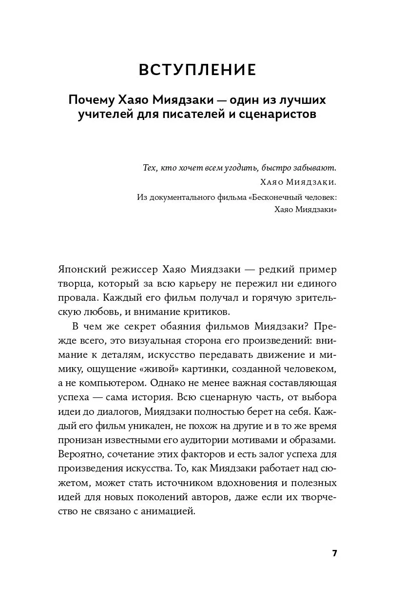 Режиссер и сценарист Хаяо Миядзаки известен и горячо любим далеко за пределами Японии. Его фильмы неизменно приковывают к себе внимание не только зрителей, но и критиков. Секрет обаяния произведений Миядзаки — в драматургических приемах, базирующихся на философских воззрениях мастера и его связи с традицией. Его уникальный опыт будет полезен новому поколению авторов, независимо от жанра, которому они отдают предпочтение.