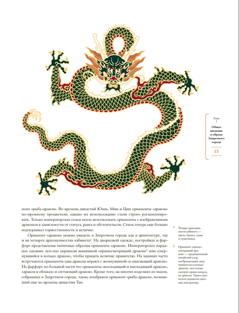 Перед вами результат длительной работы команды исследователей, которая занимается интерпретацией, реконструкцией и графическим переводом орнаментов Запретного города. Эта книга содержит сотни векторных изображений, включая отдельные узоры, наброски линий и образцы цветовой палитры. В ней отражены пять знаковых видов прикладного китайского искусства, представленных в дворцовом комплексе Пекина: вышивка, фарфор, ковры, изделия из эмали и архитектура.