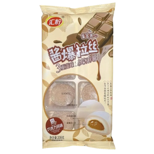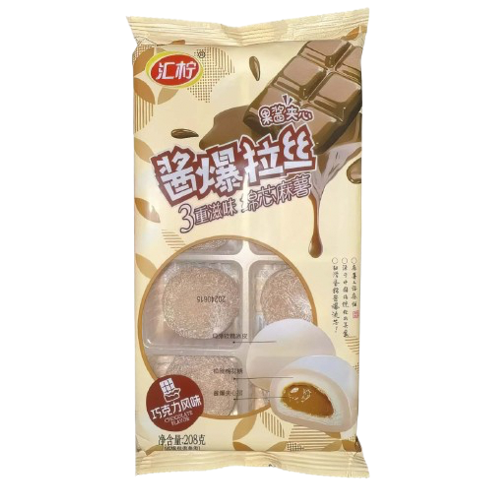 Состав: мальтозный сироп, мука из клейкого риса, питьевая вода, крахмал, шоколадный ароматизированный соус (комплексная приправа) (добавлено >10%), зефир (добавлено >8%), трегалоза, кондитерский жир, пищевые добавки (гидроксипропилдикрахмалфосфат (Е1442), желатин (Е441), моно- и диглицериды жирных кислот (Е471)), какао-порошок, комплексная приправа, пищевой ароматизатор