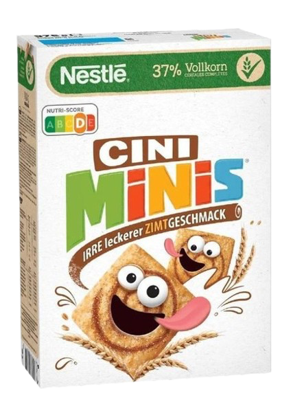 Состав: Цельнозерновая мука 37%, рисовая мука 28,5%, сахар, подсолнечное масло, глюкозный сироп, кукурузный крахмал, минерал [карбонат кальция (кальций)], поваренная соль, корица 0,3%, эмульгатор (лецитины), антиоксидант (экстракт с высоким содержанием токоферола), экстракт жареного ячменного солода, натуральный ароматизатор, краситель (аннато), минерал [элементарное железо (железо)] и витамины [никотинамид (ниацин), d-пантотенат кальция (пантотеновая кислота), гидрохлорид пиридоксина (витамин B6), гидрохлорид тиамина (тиамин), рибофлавин (витамин B2), птероилмоноглутаминовая кислота (фолиевая кислота), холекальциферол (витамин D)]
